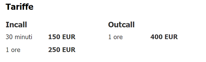 No no cene mai, sia perché io voglio solo chiavare e a nessuno dei due frega della vita altrui (sapendo poi che è tutto finto), sia perché se mangio il rischio cilecca aumenta. Cmq per risponderti di solito 150 per un ora da me, ma ti eviti parcheggi, case che non conosci, persone in casa ecc Cmq come raccontato sono stato fortunato di aver trovato una teen ita, molto carina, sui 20 mi sembra, che venne da me per soli 100 euro. Faceva tutto tranne anale, baciava leccava ecc, era molto partecipe. |
