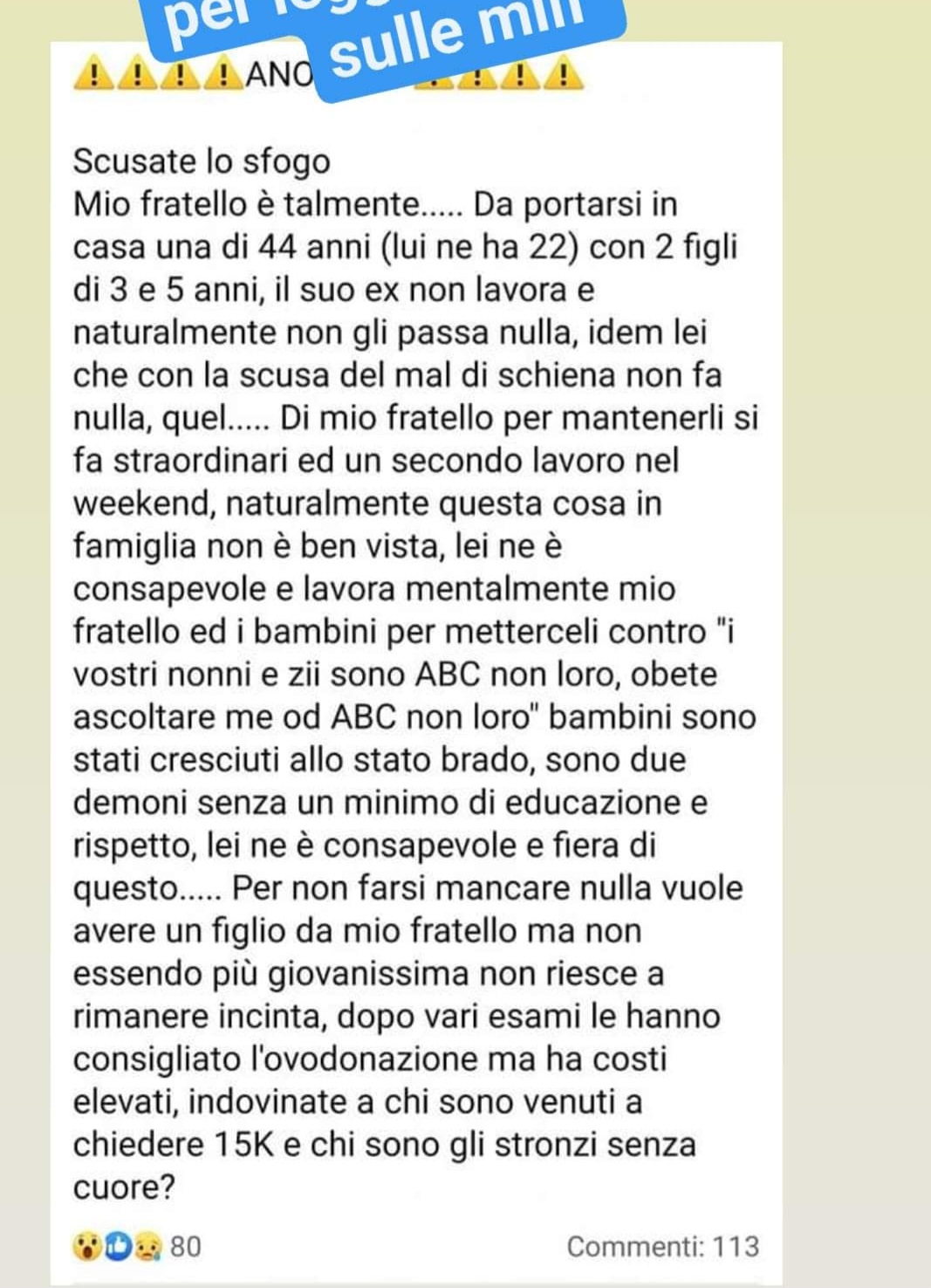 Che tristezza di storia... poi una 44enne con 2 figli piccoli che vuole avere un figlio da uno che potrebbe a sua volta esserlo di lei... e poi dite che tutte le np dovrebbero figliare! Ma lol guardate che madre hanno sti poveri bimbi Io invece farei sterelizzare il 99,99 % delle NP!! |