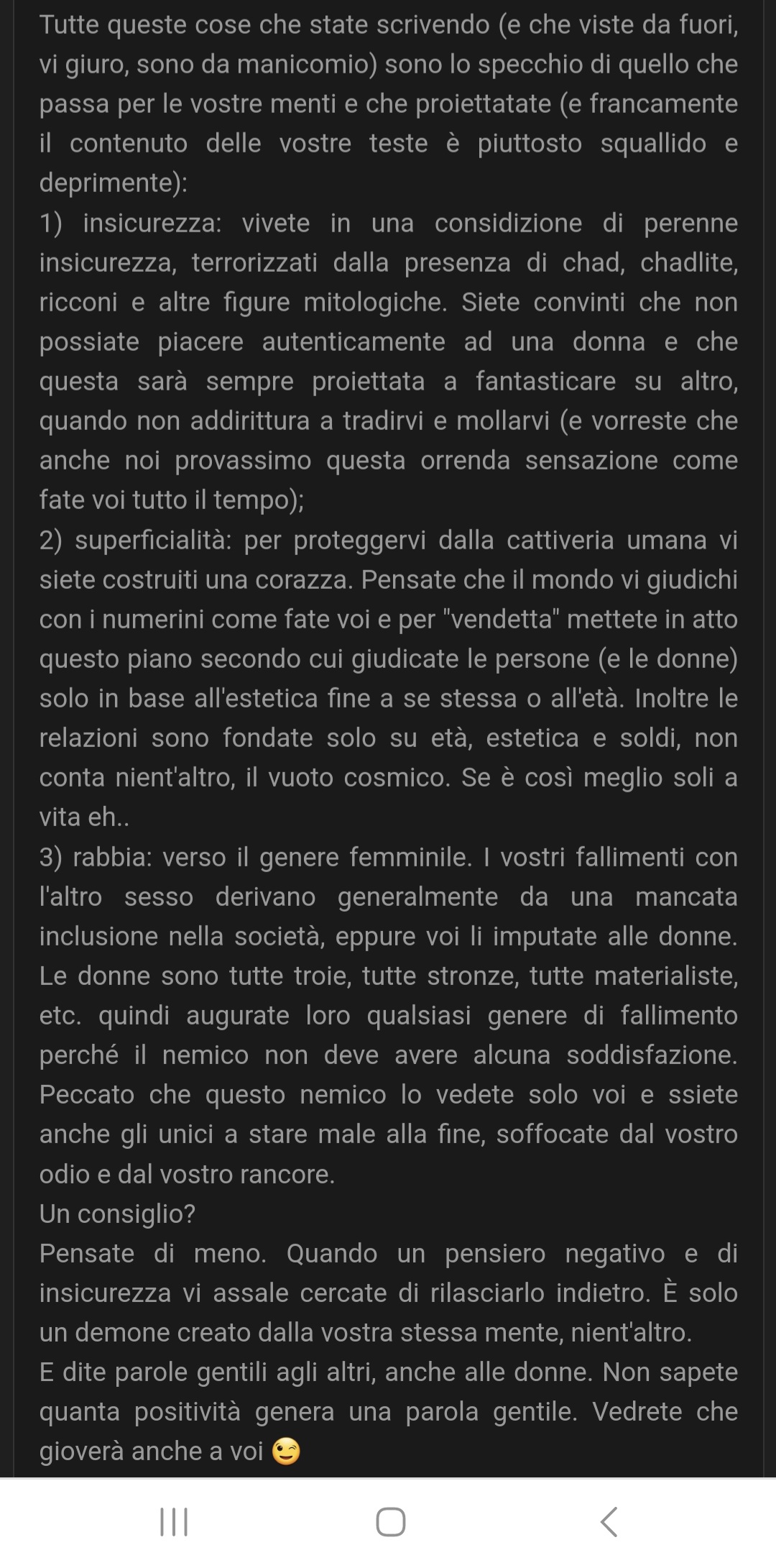 Questo non è il FdB che ricordo io. Tanti utenti validi se ne sono andati, come Blue, Scarabocchio, Ratto di Fogna, Abitante delle Fogne e quell'utente che aveva l'avatar di Dante Alighieri di cui non ricordo il nome. Prima qua ci si consolava, ci si capiva, c'era empatia. Ci si chiamava fratelli l'un l'altro. Adesso si fanno flame, ci si attacca l'un l'altro e si crea un ambiente ostile Ma se già la RL è per noi un ambiente ostile, e una cerca un po' di conforto in un forum, cosa trova qui? Gente che litiga. Io personalmente non ricordo di essere mai stato attaccato da nessuno, a parte Bardack che fortunatamente se né andato. Ma vedere il FdB ridotto cosí a gente che litiga fra loro e impazzisce non fa venire voglia di frequentarlo, a prescindere che si sia attaccati direttamente o si veda un ambiente ostile tra gli altri. |
