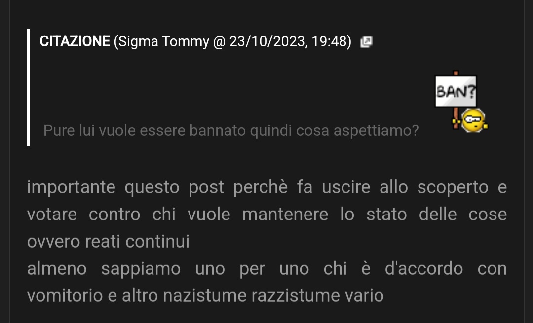 non è andato contro il regolamento, stava solo sul cazzo ad altri utenti This Non è stato bannato perché stava sul cazzo agli altri, ma perché usava epiteti offensivi verso gli altri utenti. Epiteti offensivi lol Ma se in ogni thread veniva ricoperto di insulti |